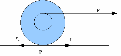 Al estirar de la cuerda con una fuerza F, el disco tenderá a deslizar hacia la derecha, lo que hará aparecer una fuerza de rozamiento contra la superficie, que le obligará a girar. Supongamos de momento que esa Fr necesaria para hacerlo girar sea inferior a la máxima fuerza de rozamiento estática (Fr)max = μ N = μ m g, es decir, que estemos en el caso de rodadura sin deslizamiento. (μ es el coeficiente de rozamiento estático en este caso, y el punto P está en todo momento en reposo relativo respecto al suelo, siendo el centro instantáneo de rotación) La segunda ley de Newton aplicada al movimiento de traslación nos dice que: F – Fr = m a La segunda ley de Newton aplicada al movimiento de rotación nos dice que: F r + Fr R = ½ (mR2)α La condición de que ruede sin deslizar exige en todo momento que: a = R α De la segunda ecuación y usando la tercera, puede escribirse que Fr + FrR = ½ mRa ; Poniendo el valor de la primera para el producto m*a tendremos: Fr + FrR = ½ R (F – Fr), de donde se puede despejar el valor de Fr , que resulta ser